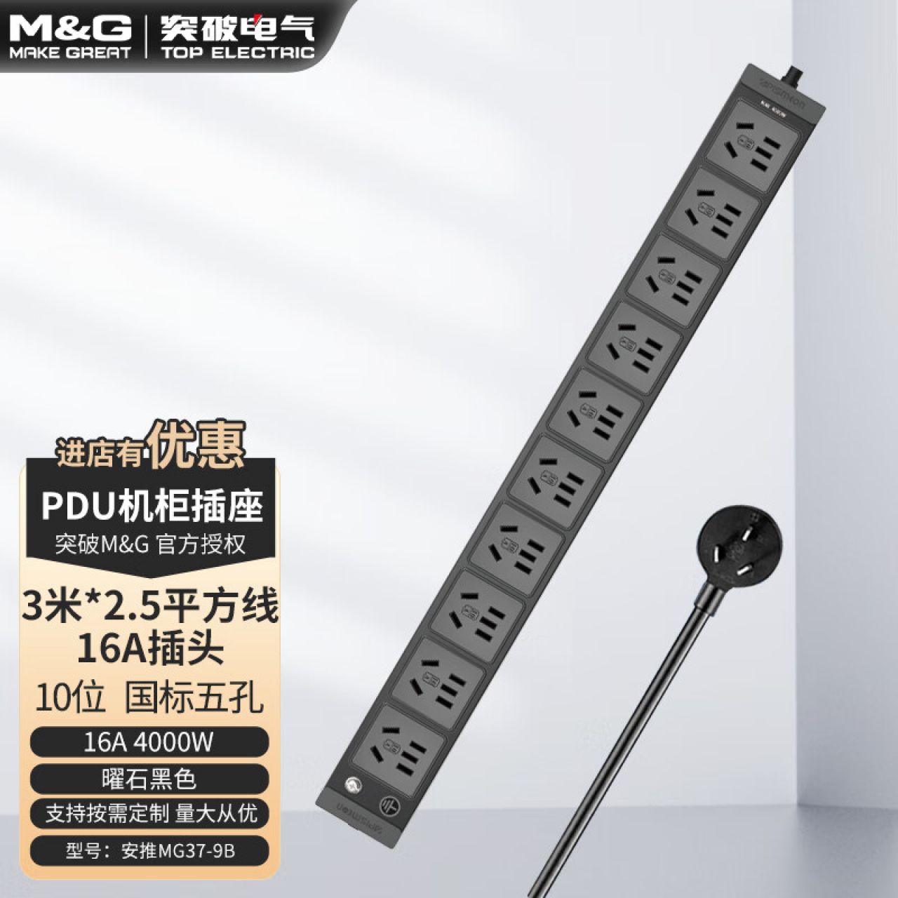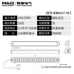 M&G突破PDU机柜插座8位10A国标五孔总控10A输入1平方2米线10A插头07TG200104