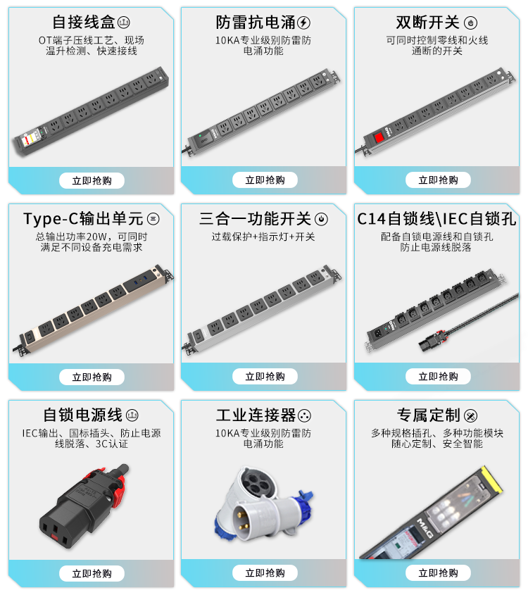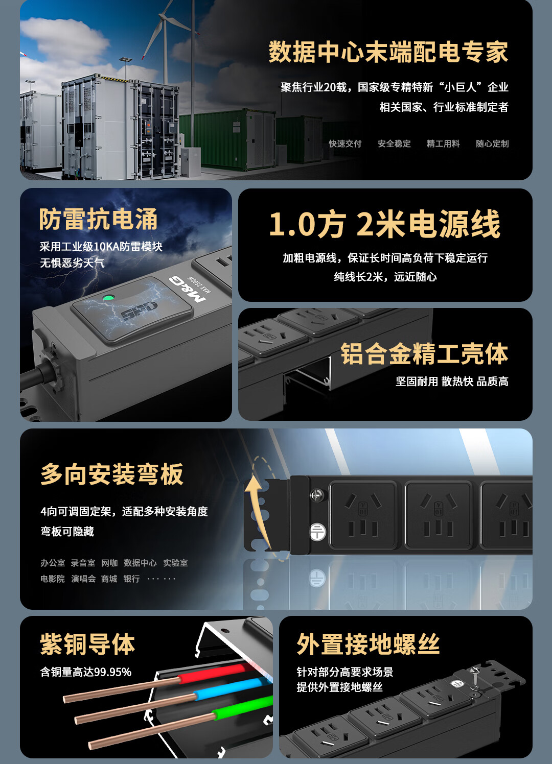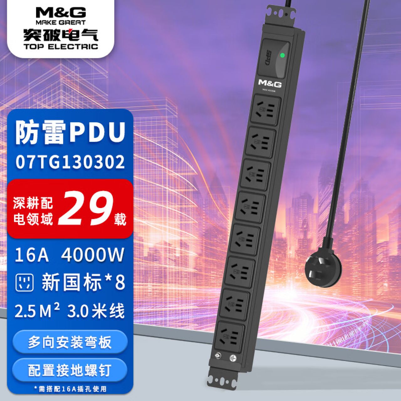M&G突破PDU机柜插座8位10A国标五孔总控10A输入1平方2米线10A插头07TG200104