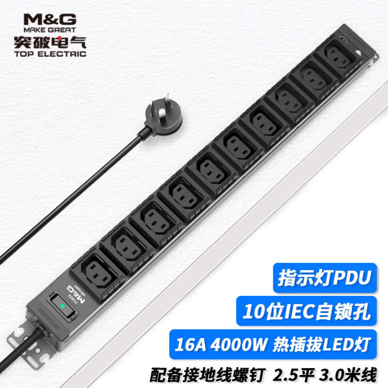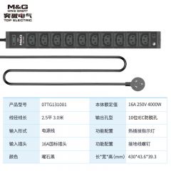 M&G突破PDU机柜插座8位10A国标五孔总控10A输入1平方2米线10A插头07TG200104