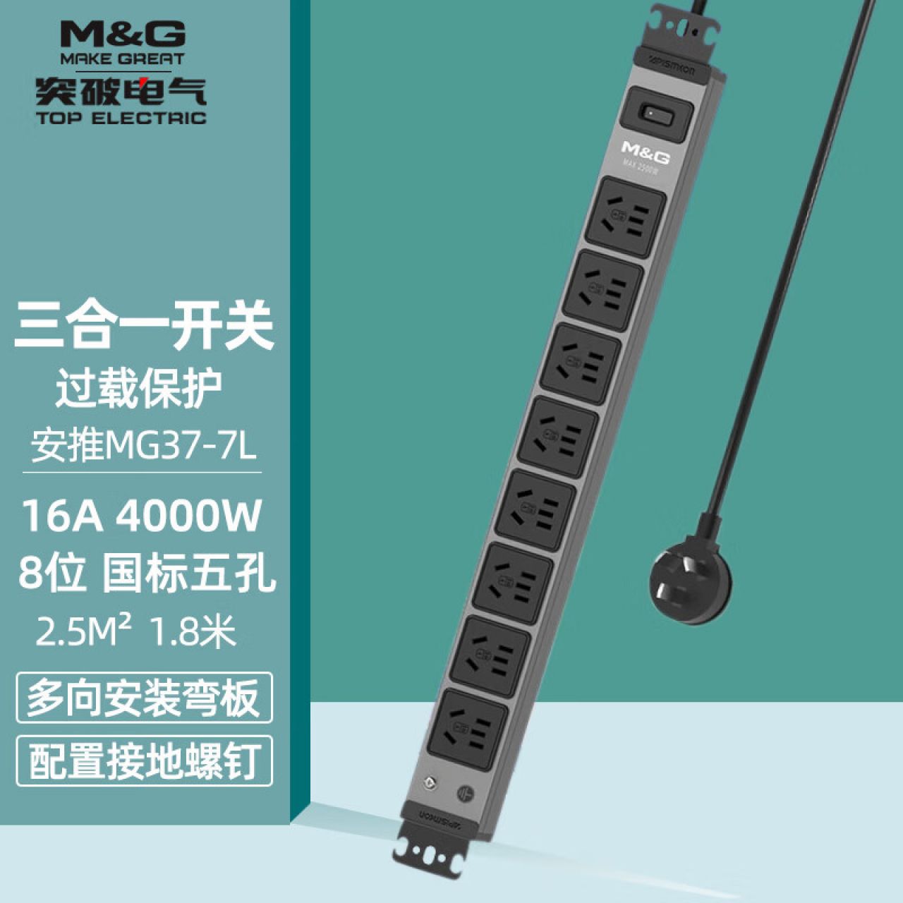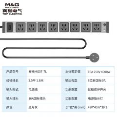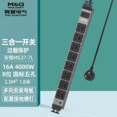 M&G突破PDU机柜插座8位10A国标五孔总控10A输入1平方2米线10A插头07TG200104