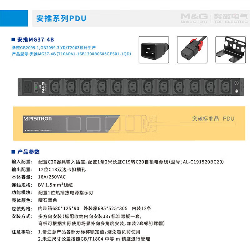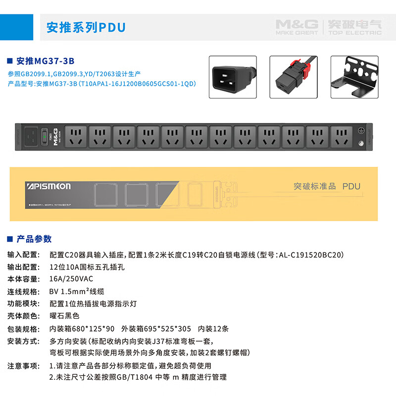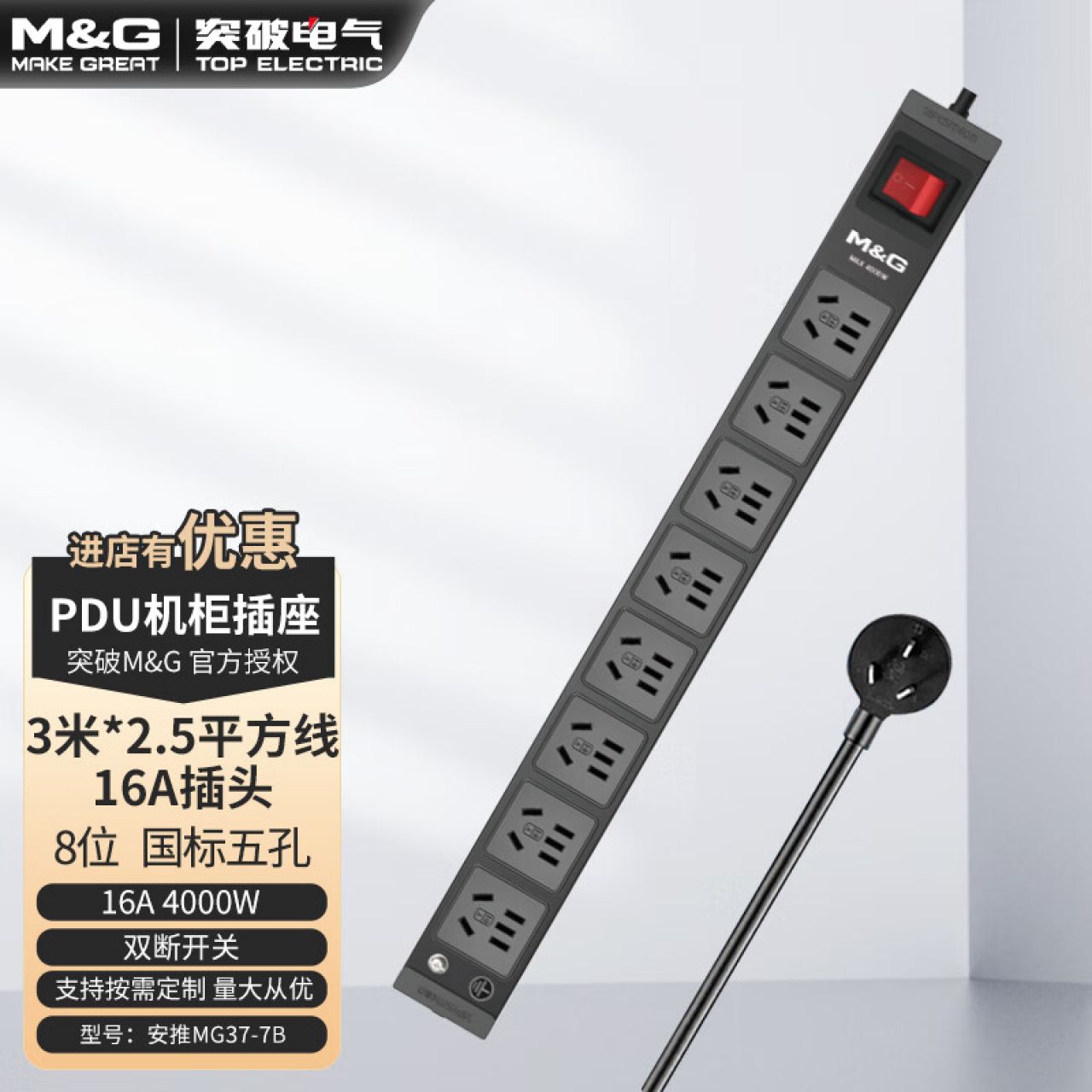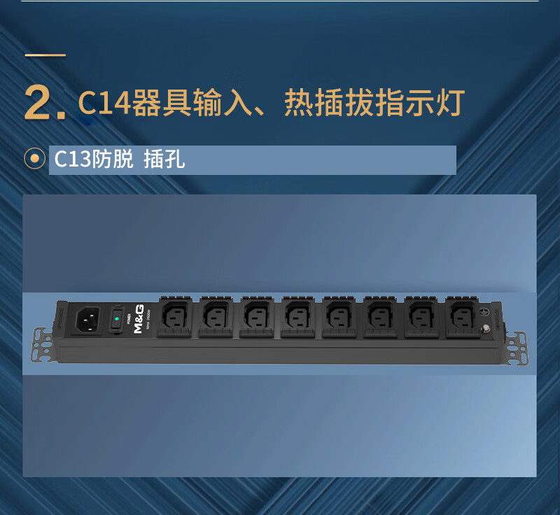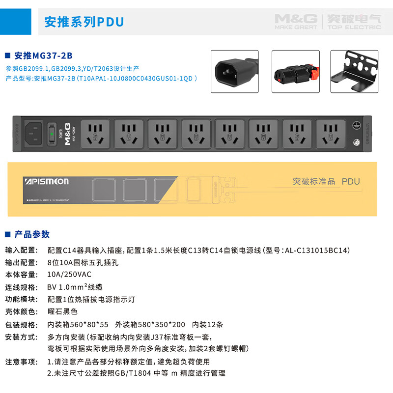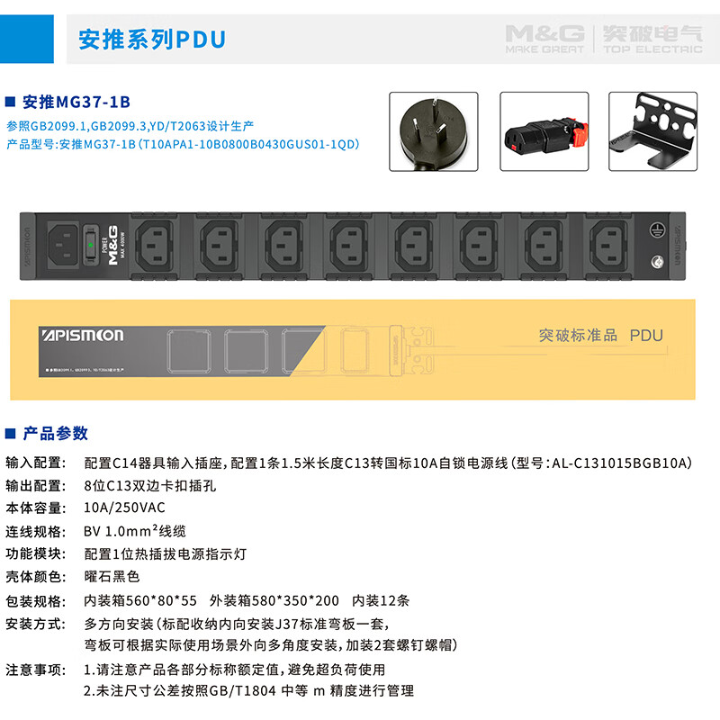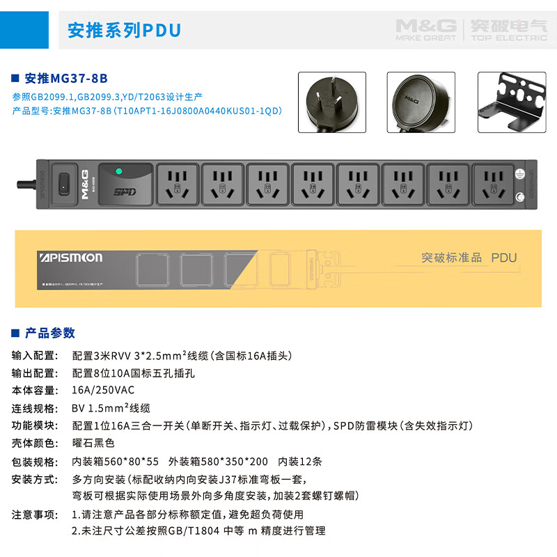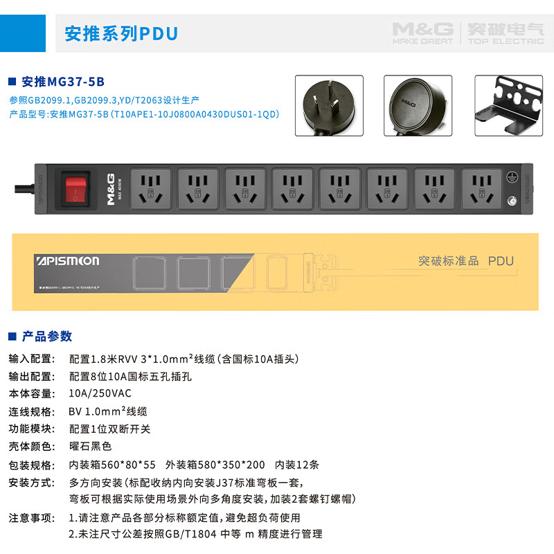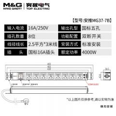 M&G突破PDU机柜插座8位10A国标五孔总控10A输入1平方2米线10A插头07TG200104