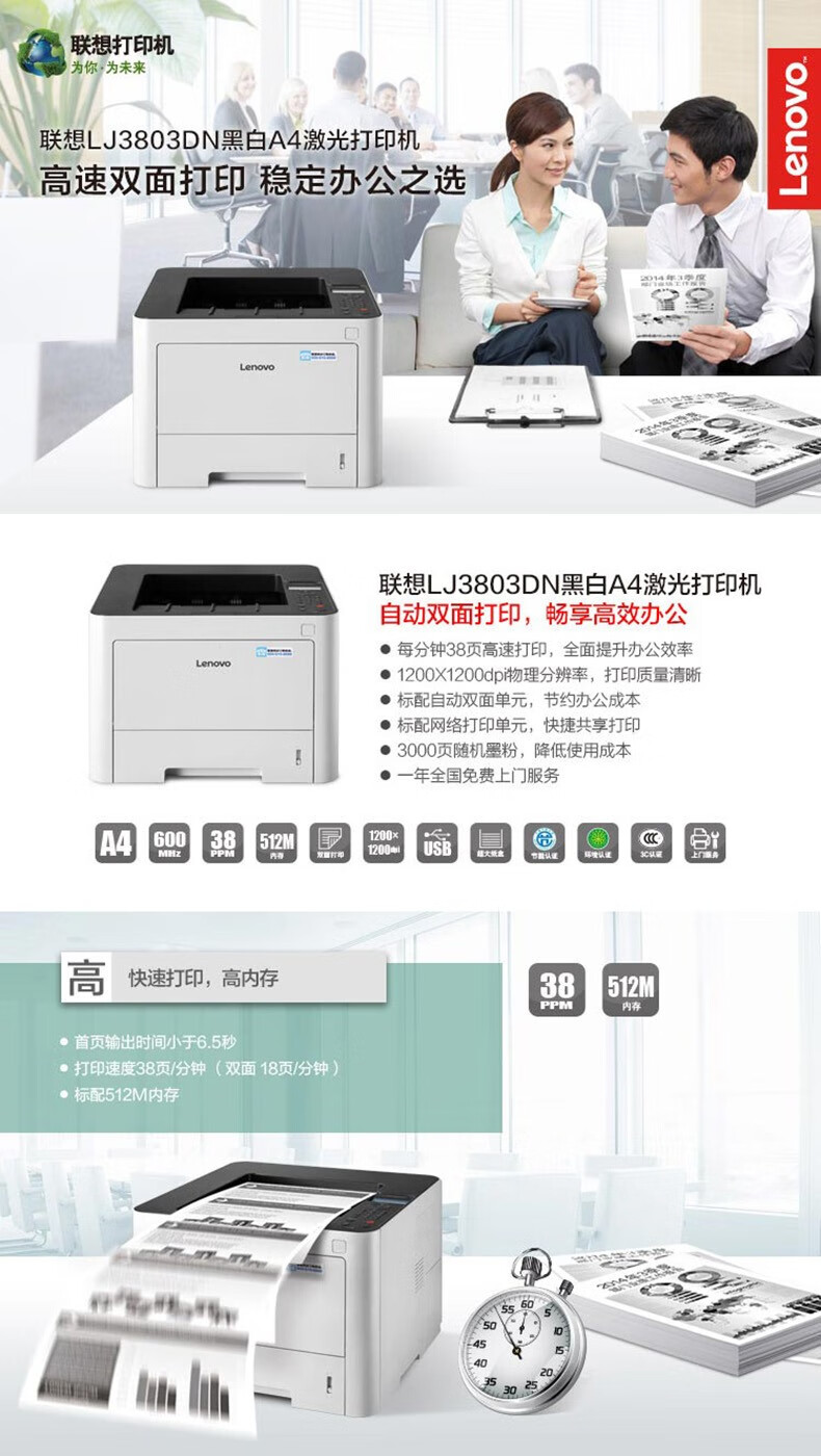 联想 LJ3803DN 黑白激光打印机 38页/分钟高速打印 有线网络自动双面 办公商用 企业优选