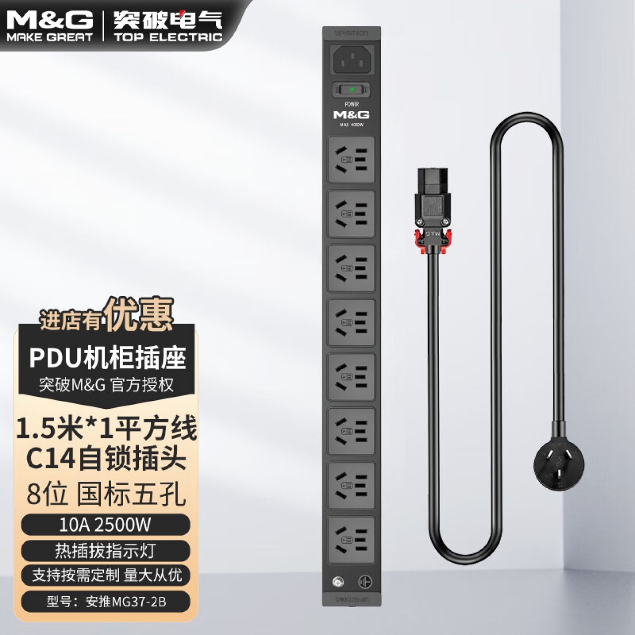 M&G突破PDU机柜插座8位10A国标五孔总控10A输入1平方2米线10A插头07TG200104